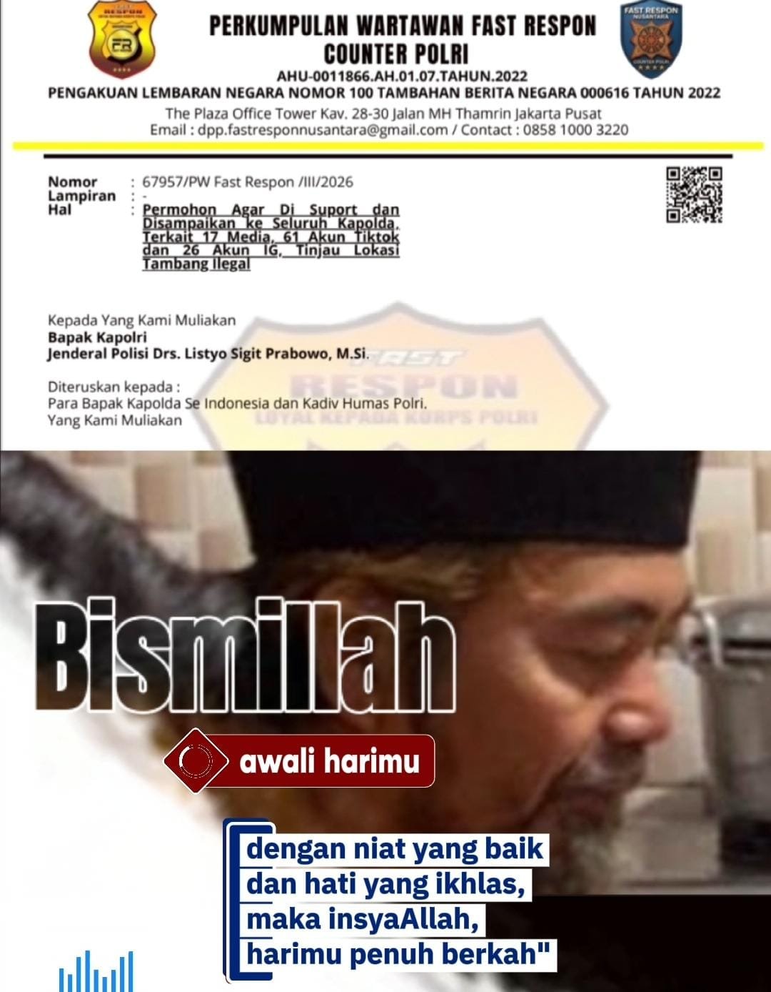 Jakarta – Ketua Umum Persatuan Wartawan Fast Respon Nusantara (PW-FRN), Agus Flores, akhirnya melayangkan surat resmi kepada Kapolri terkait dugaan carut-marutnya penegakan hukum terhadap praktik tambang ilegal di Indonesia.