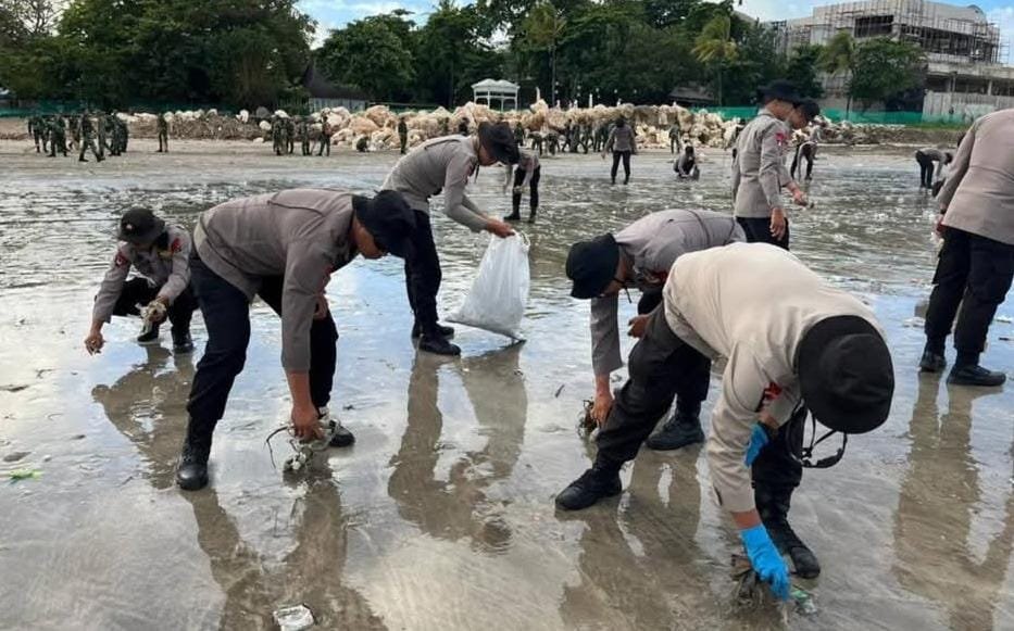 Aksi tersebut melibatkan personel gabungan yang bahu-membahu bersama warga setempat dan pengelola kawasan. Mereka menyisir garis pantai untuk memungut sampah plastik, potongan kayu, hingga limbah organik yang terbawa arus laut dan menumpuk di sepanjang pesisir.
