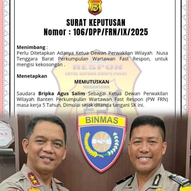 SK tersebut menegaskan, Bripka Agus Salim akan memimpin FRN NTB selama masa jabatan lima tahun ke depan, dengan mandat besar untuk memperkuat peran dan eksistensi organisasi wartawan di daerah.