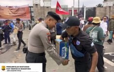 Aksi Simpatik, Polisi Bagikan Air Mineral dan Roti kepada Buruh di Depan DPR/MPR