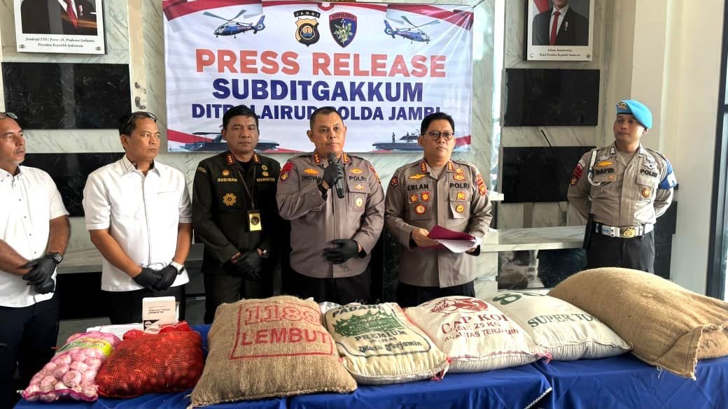 Jambi, radar91.com – Direktorat Polisi Perairan dan Udara (Ditpolairud) Polda Jambi menggelar konferensi pers terkait pengungkapan kasus pengangkutan komoditas pertanian dan bahan kebutuhan pokok tanpa dokumen karantina yang sah.