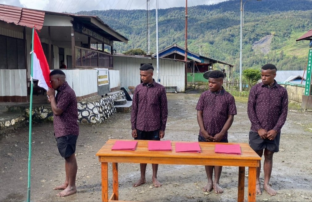 Puncak, radar91.com — Sebanyak empat anggota Kelompok Kriminal Bersenjata (KKB) dari Kodap III Sinak secara resmi menyatakan ikrar setia kepada Negara Kesatuan Republik Indonesia (NKRI). Prosesi yang berlangsung khidmat ini dilaksanakan pada Rabu (9/7/2025) di halaman Markas Koramil 1717-02/Sinak, Distrik Sinak, Kabupaten Puncak, Papua Tengah, pada pukul 13.50–14.50 WIT.