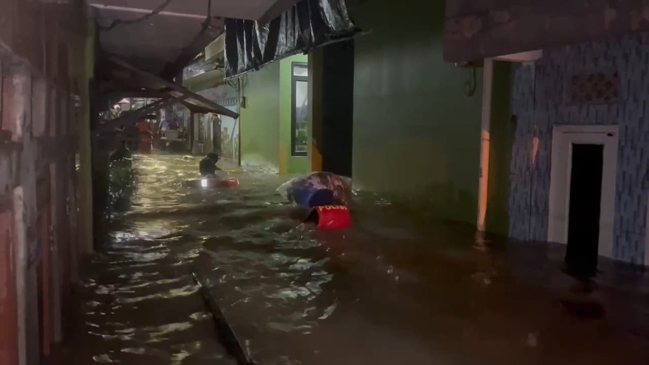 Banjir di daerah tersebut terjadi karena hujan lebat dan mengakibatkan luapan Kali Ciliwung.
