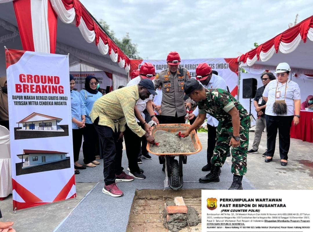 Usai prosesi sambutan, Kapolres Merauke bersama para pejabat yang hadir melakukan peletakan batu pertama dan pemberian semen sebagai tanda dimulainya pembangunan Dapur Makan Bergizi Gratis di Kabupaten Merauke.