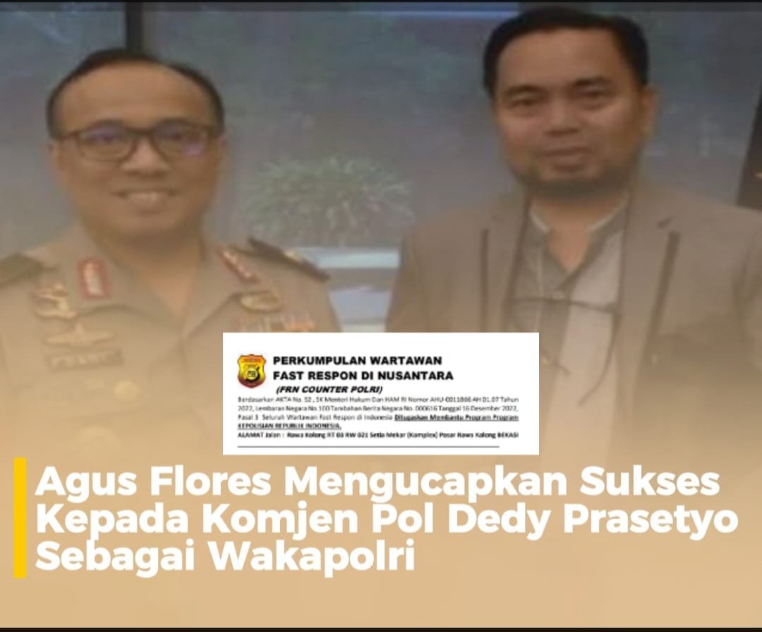 Jakarta, radar91.com – Ketua Umum Fast Respon Nusantara (FRN) R.Mas MH Agus Rugiarto SH biasa disapa Agus Flores, mengucapkan sukses kepada Komjen Pol. Prof. Dr. Dedy Prasetyo S.H., M.Hum., M.Si., M.M., sebagai Wakapolri, menggantikan Komjen Pol Achmad Dofiri.