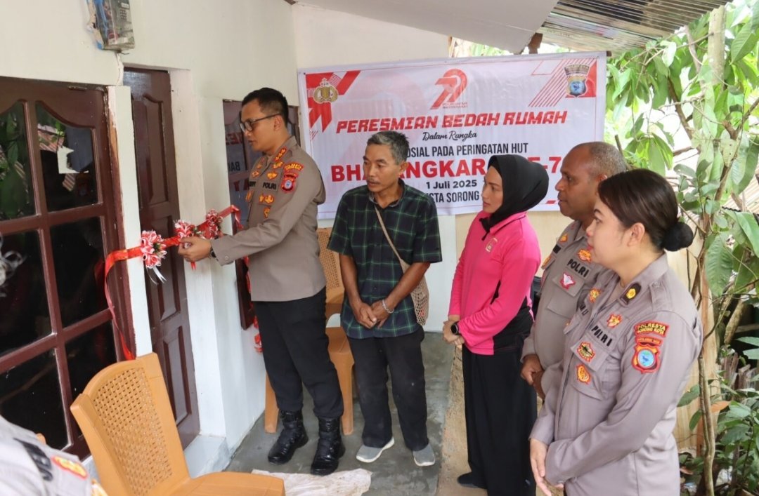 Kota Sorong, radar91.com – Dalam rangka memperingati Hari Bhayangkara ke-79, Polresta Sorong Kota melaksanakan kegiatan Bhakti Sosial berupa peresmian rumah hasil program bedah rumah milik Bapak Nanang Sudrajat, bertempat di Lorong Obadiri, Kelurahan Remu Selatan, Distrik Sorong Manoi, Kota Sorong, Papua Barat Daya. Rabu, 2 Juli 2025.