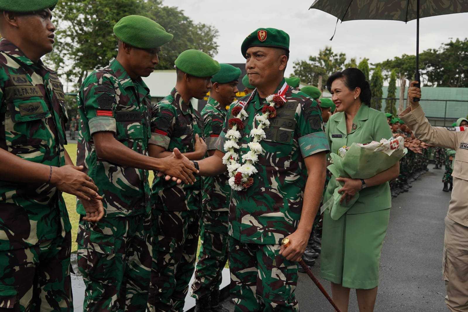 Palu – Pangdam XXIII/Palaka Wira, Mayjen TNI Jonathan Binsar Parluhutan Sianipar didampingi Ketua Persit Kartika Chandra Kirana Daerah XXIII/Palaka Wira, Ny. Dewi Binsar Sianipar tiba di Markas Kodam XXIII/Palaka Wira, Jalan Jenderal Sudirman, Palu, pada Senin (1/9/2025). Kedatangannya disambut dengan tradisi satuan berupa penciuman duaja sebagai simbol penghormatan dan penerimaan resmi di lingkungan Kodam.
