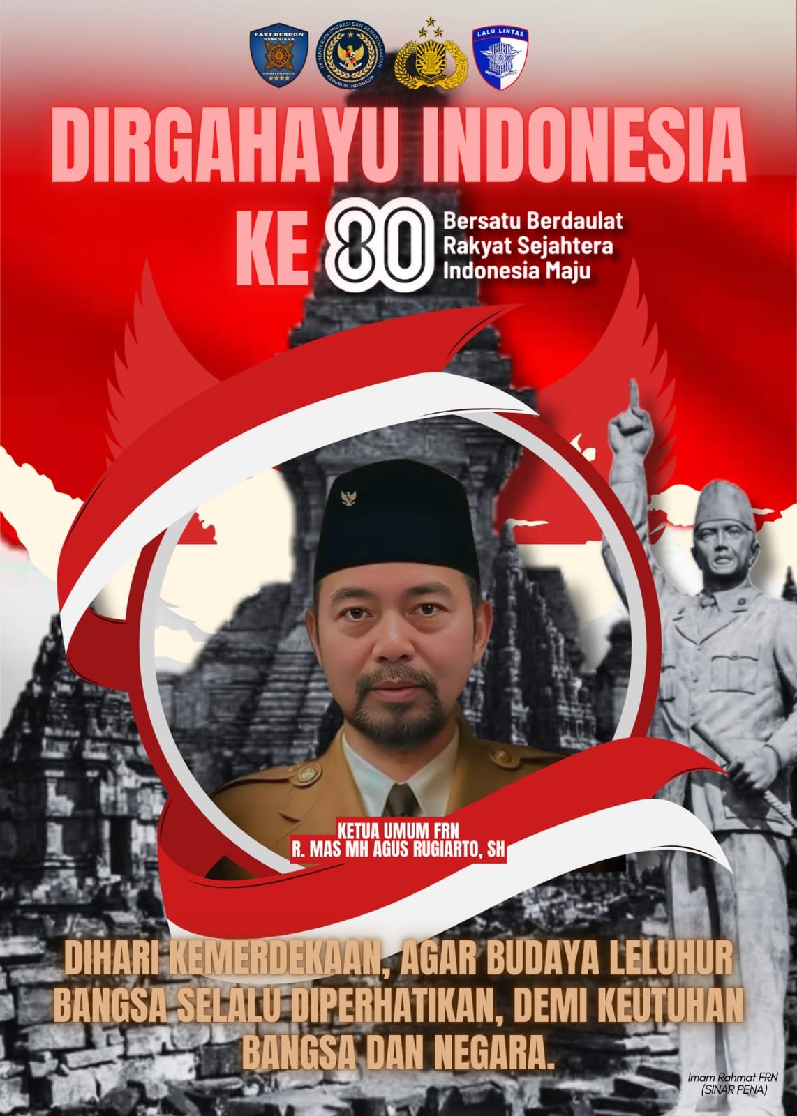 Jakarta, radar91.com – Ketua Umum Dewan Pimpinan Pusat (DPP) Fast Respon Nusantara (FRN) Counter Polri, R. Mas MH. Agus Rugiarto SH atau yang akrab disapa Agus Flores, menyampaikan ucapan selamat memperingati Hari Ulang Tahun (HUT) ke-80 Kemerdekaan Republik Indonesia.