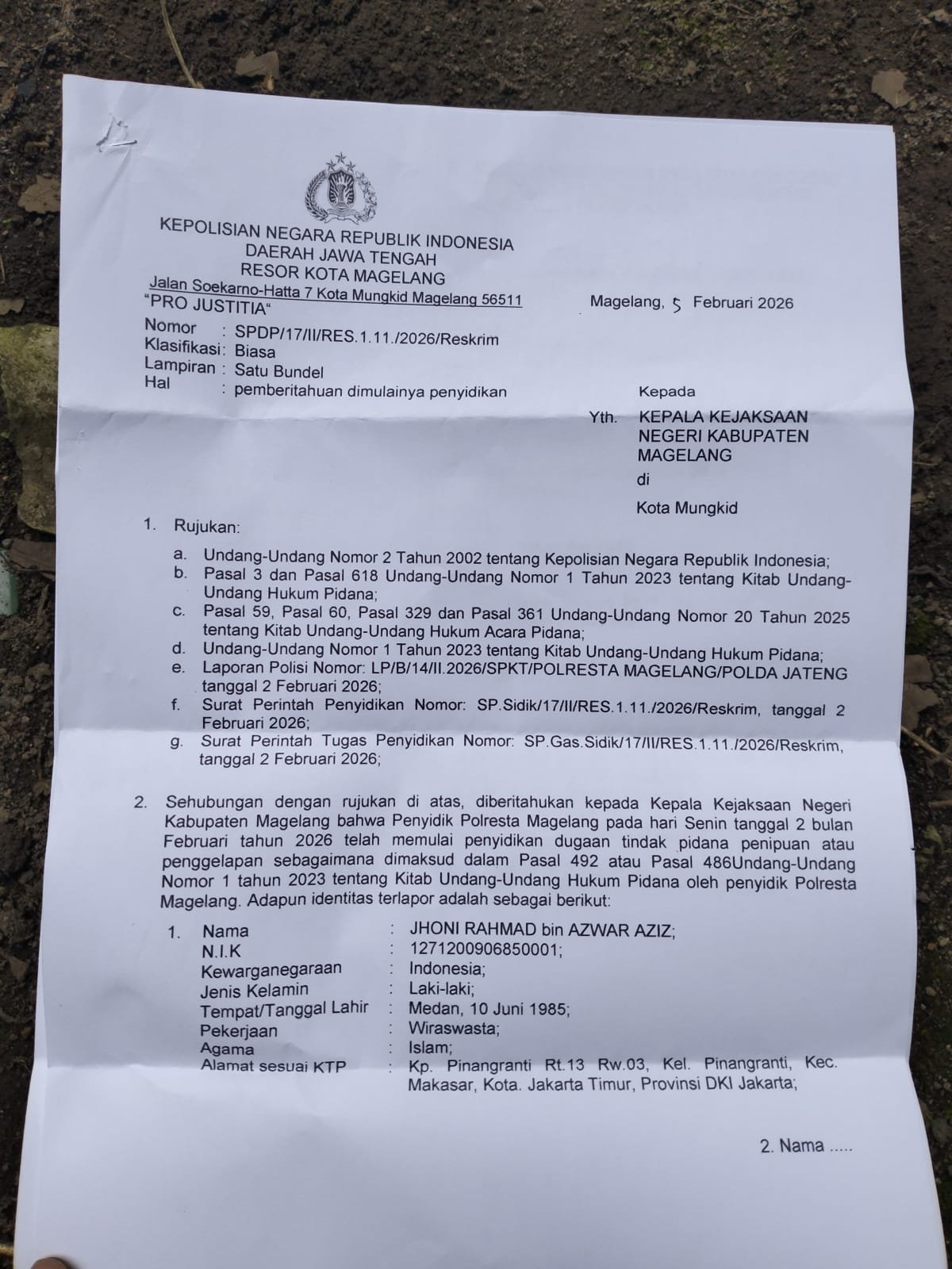 Polresta Magelang Polda Jawa Tengah telah menerima laporan tersebut dan saat ini tengah melakukan penyelidikan untuk mengungkap kasus penipuan ini. “Kami akan mengusut tuntas kasus ini dan memastikan bahwa pelaku penipuan dapat diadili,” kata Kapolresta Magelang, Kasat Reskrim Polresta Magelang