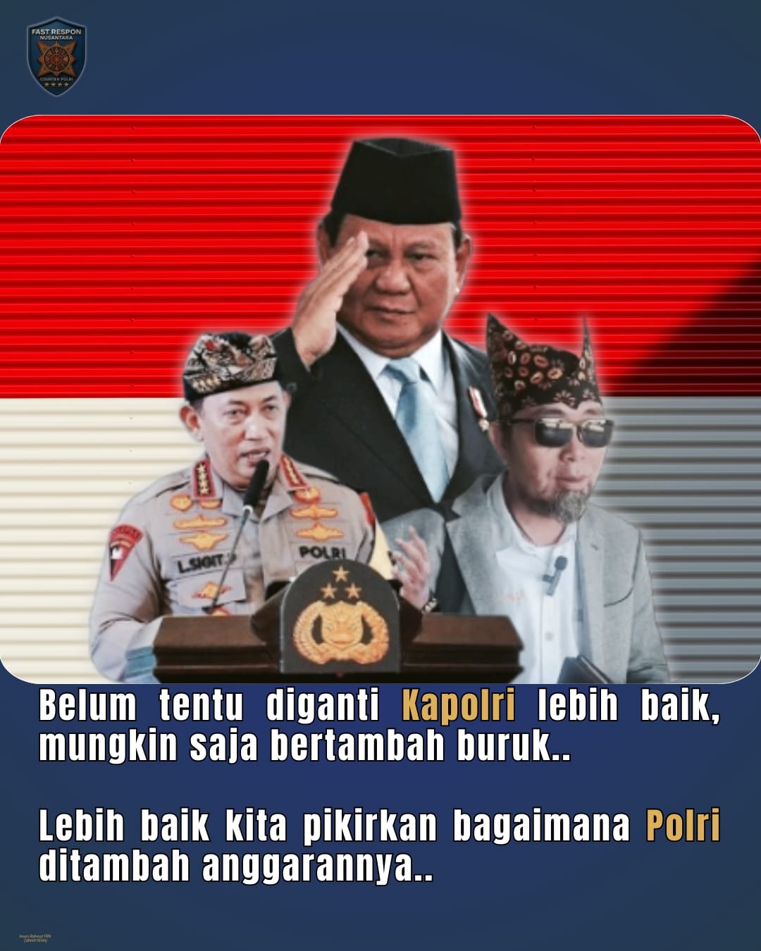 PW FRN menegaskan, Polri adalah garda terdepan dalam menjaga stabilitas nasional. Karena itu, yang paling mendesak adalah memperjuangkan tambahan anggaran, bukan menebar spekulasi pergantian pucuk pimpinan.