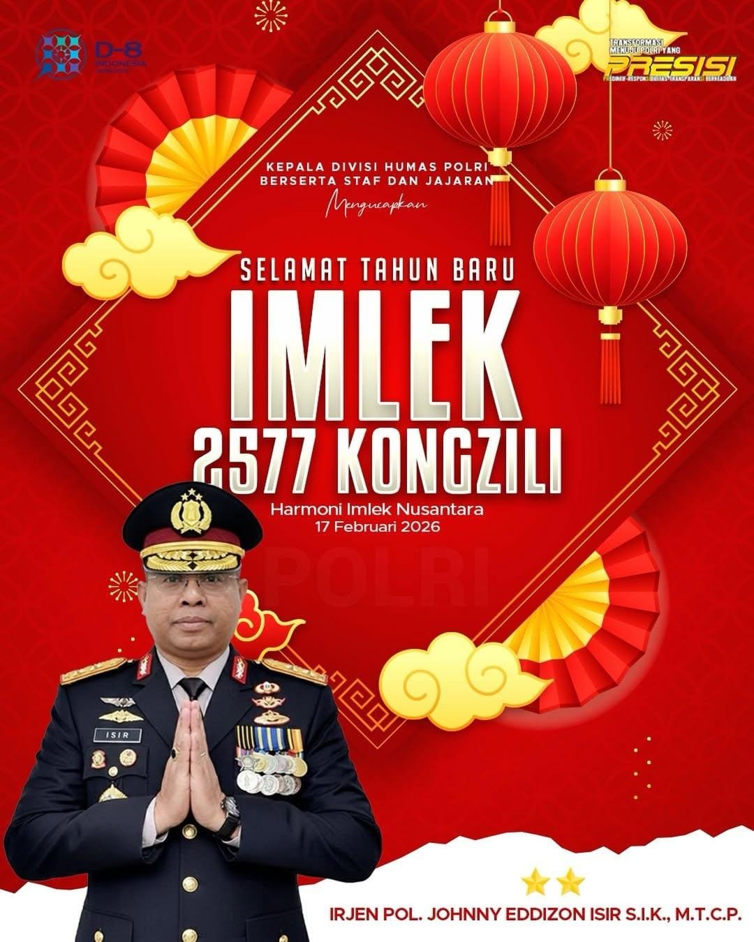 Jakarta, radar91.com – Kepala Divisi Humas Polri, Irjen Pol. Johnny Eddizon Isir, S.I.K., M.T.C.P., menyampaikan ucapan selamat merayakan Tahun Baru Imlek 2577 Kongzili kepada seluruh masyarakat yang merayakannya pada Selasa, 17 Februari 2026.